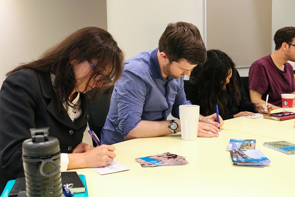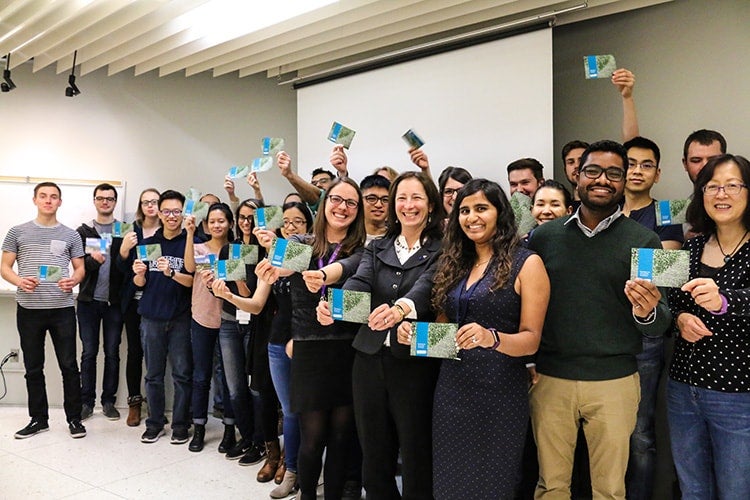 Among the first to sign the U of T postcards were young researchers at the Shoichet Lab, whose work to use stem cells to cure blindness is featured on one of the cards.