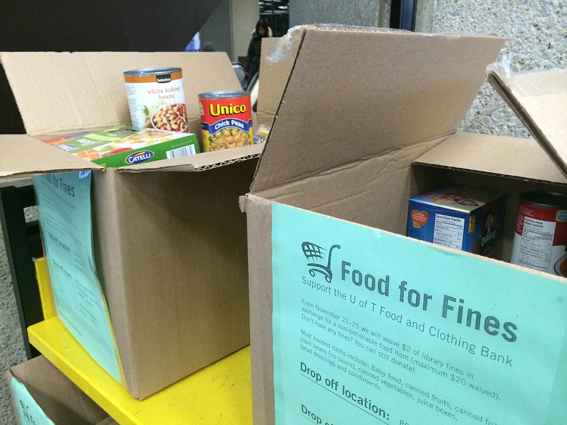 Until Friday, University of Toronto libraries will forgive $2 of overdue fines for each nonperishable food item donated, waiving up to $20 per person. The donations are sent to the U of T Food and Clothing Bank, a year-round campus resource for students run out of the Multi-Faith Centre.