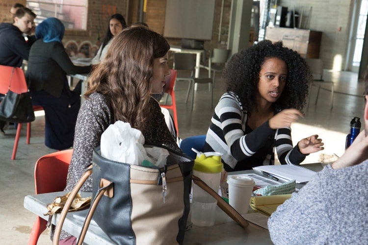 Master's students Terhas Ghebretecle and Alexandra Izgerean work on their assignment at Evergreen Brick Works (photo by Romi Levine)