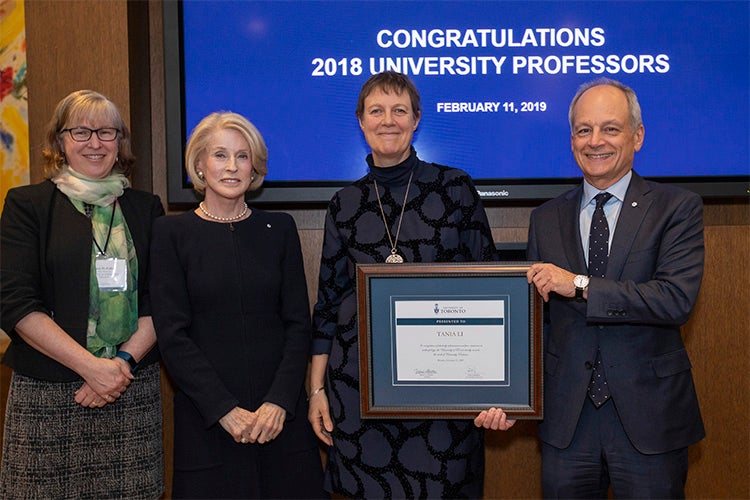 Tania Li is presented with a plaque honouring her University Professor appointment by U of T President Meric Gertler, Chancellor Rose Patten and Susan McCahan in February 2019 (photo by Nick Iwanysyhn)