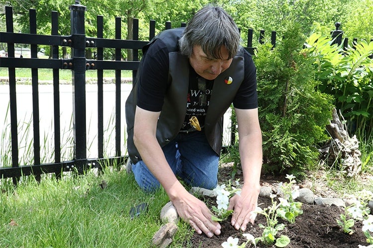 He's pulling weeds, planting native flora and watering plants that can be used later – sage and sweet grass for ceremonial smudging, cedar to brew in a healing tea, and tobacco that can be used to create a tie for a traditional gift.