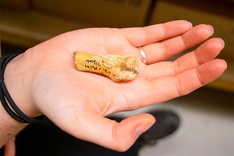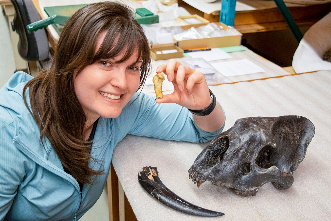 Ashley Reynolds holds the Smilodon fatalis metacarpal from Medicine Hat (photo by Danielle Dufault/ROM)