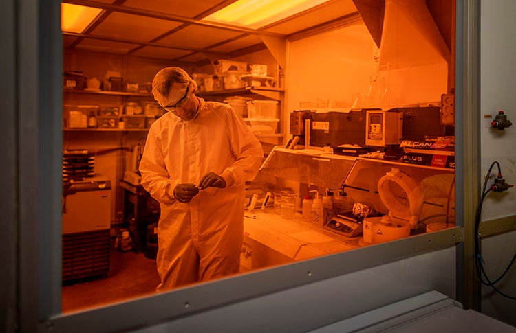 Axel Guenther, scientific director in the Centre for Microfluidic Systems, inspects microfluidic devices in a cleanroom (photo by Nick Iwanyshyn)