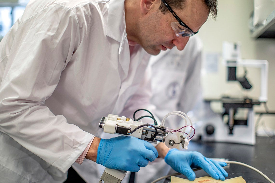 Guenther’s team, for example, used microfluidic technology to create a handheld 3D skin printer that deposits layers of skin tissue to cover and heal deep wounds. The size of a small shoebox, the device weighs less than a kilogram and functions like a white-out tape dispenser that deposits thin sheets of skin tissue.