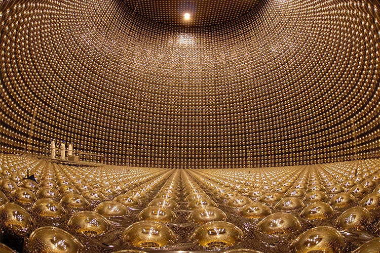Lining the inside of the tank are 13,000 highly sensitive photon detectors designed to record the very faint light generated in collisions between incoming neutrinos and the water.