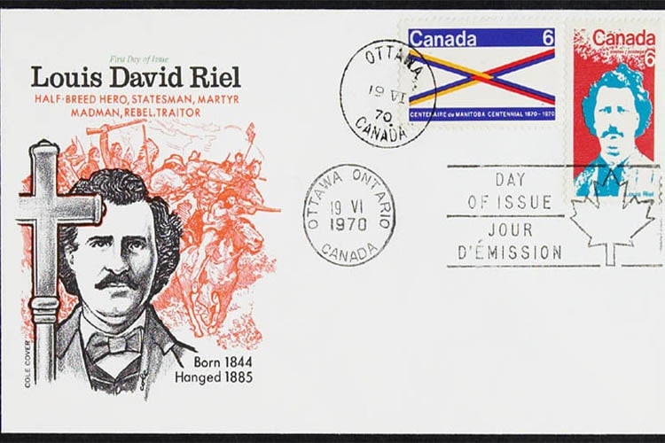 Canada Post issued this Louis Riel postcard and stamp in June 1970, one hundred years after Manitoba entered Confederation (photo courtesy of Library and Archives Canada)