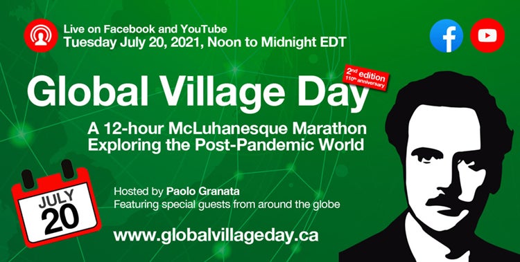 While this year’s Global Village Day will once again be entirely virtual, participants will show themselves passing around the marathon’s “torch” on their screens: an object of their choosing that they believe represents the idea of the global village in the 21st century. At the close of the event at midnight, there will be a toast to McLuhan to mark the 110th anniversary of his birth on July 21.