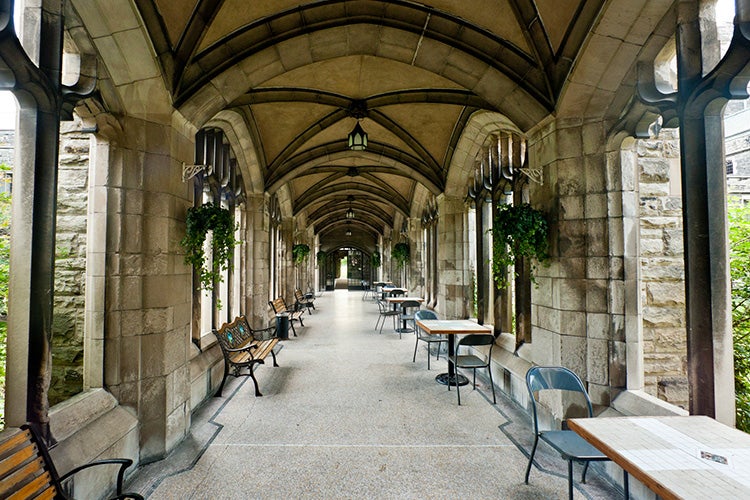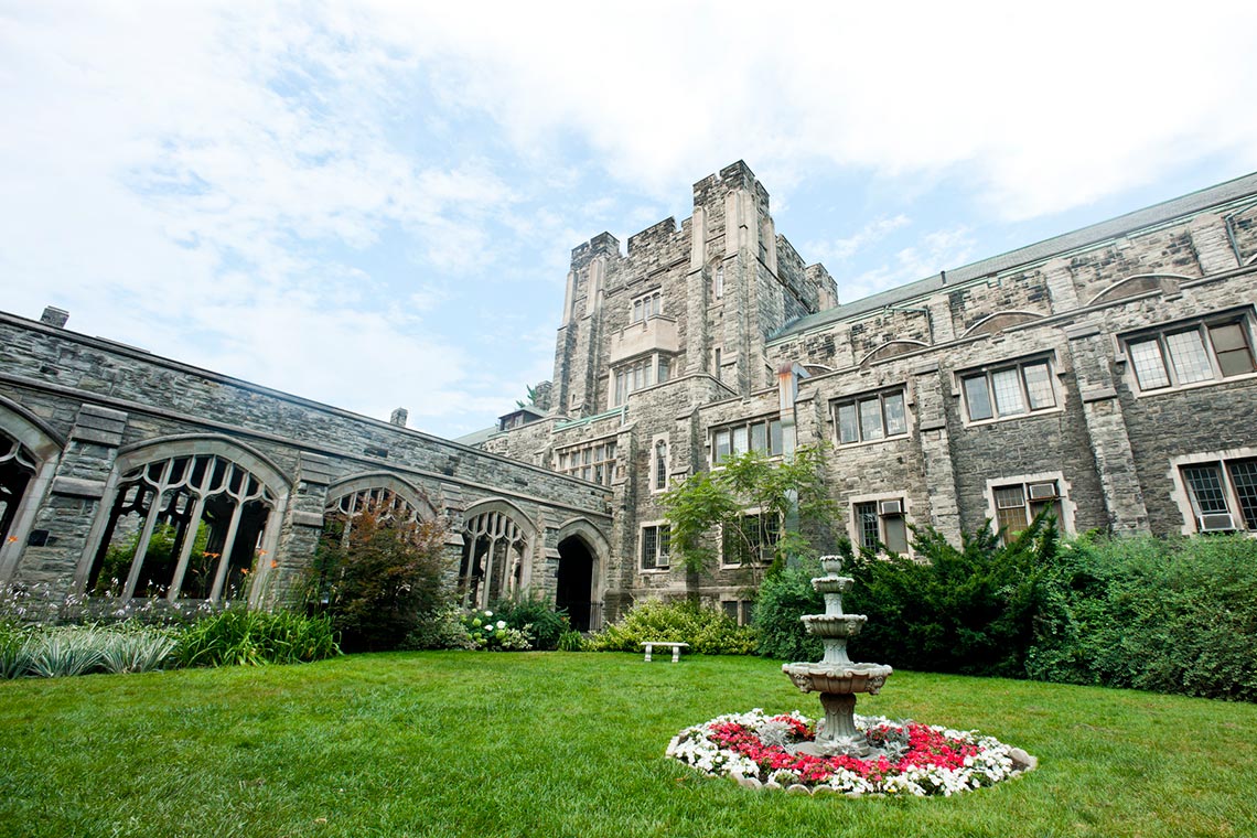 The building’s edifice has a U-shaped configuration that’s divided in half by a covered gallery, creating two stunning courtyards. Wrapping around the cloisters are classrooms, office spaces, a library, chapel and roughly 100 student dormitory rooms that house U of T undergraduate and graduate students as well as Knox College theological students.