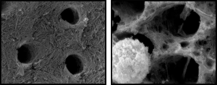 Collagen after incubation with neutrophils for 24 hours: Image at right depicts a loss of collagen fibril network when incubated with neutrophils (courtesy of Russel Gitalis)