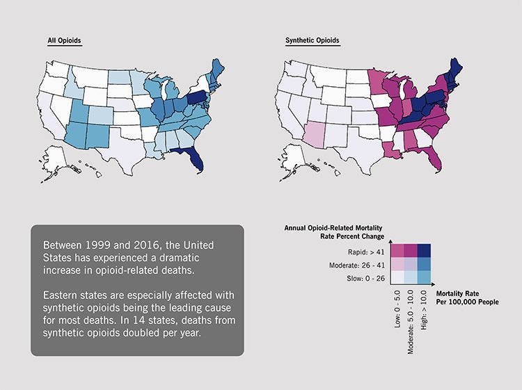 Synthetic opioids now by far outnumber heroin deaths in most eastern states. In 28 states, opioid-related deaths from synthetic opioids doubled every two years. In half of those states, deaths doubled every year.