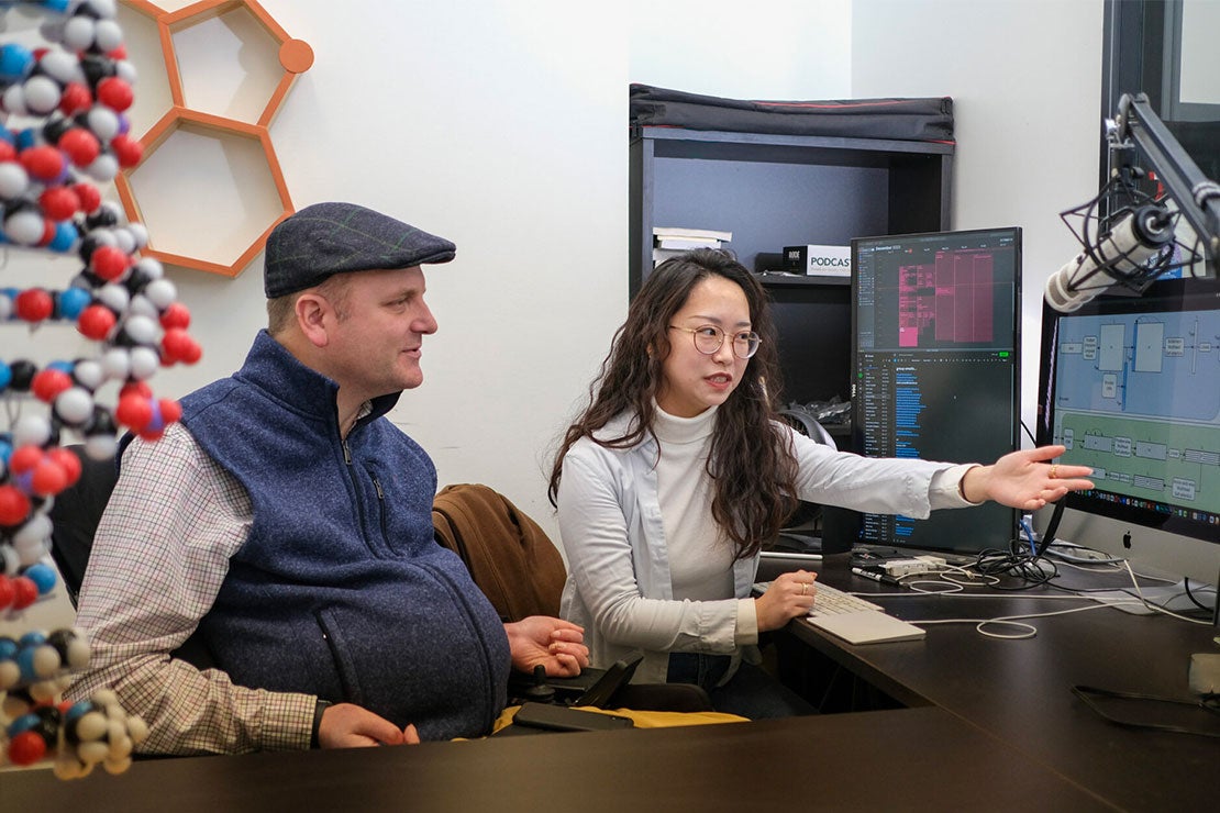 Michael Garton, left, an associate professor of biomedical engineering, and PhD candidate Suyue Lyu, right, used AI to custom-design variants of hexons that are distinct from natural sequences to help evade the immune system (photo by Qin Dai)