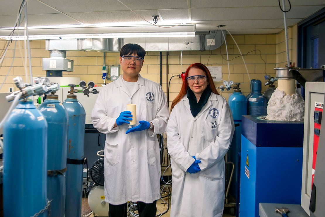 PhD candidate Jaesuk Paeng (left) and Professor Gisele Azimi from the department of chemical engineering and applied chemistry in U of T's Faculty of Applied Science & Engineering display an electrochemical cell that's vital to their novel steel-recycling method (photo by Safa Jinje)