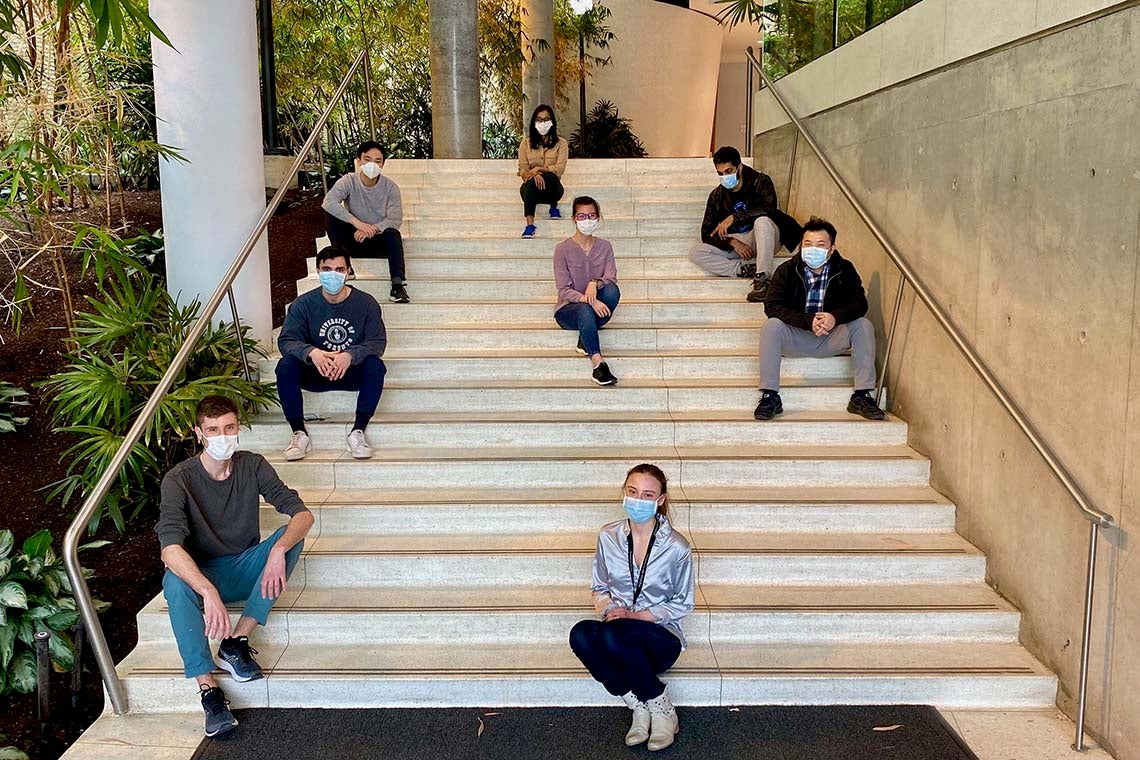 Graduate students working through the lockdown to develop a portable, rapid and sensitive COVID-19 test are pictured in the Donnelly Centre lobby wearing masks and practising physical distancing (photo by Alexandros Sklavounos)
