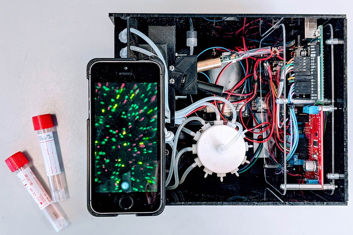 Matthew Osborne, a second-year graduate student in the lab, is tasked with fitting the entire process – from receiving a swab sample to detecting viral material inside it – into a portable device with a smartphone readout.