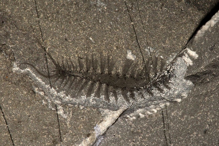 'Kootenayscolex barbarensis' is part of a group of animals called annelids (or the ‘ringed worms’). It had a pair of long sensory structures called palps on its head, with a small medial antenna between them. Its body was covered in fleshy appendages called parapodia which bear bristles called chaetae. These structures are used for movement (photo by Jean-Bernard Caron / © Royal Ontario Museum)