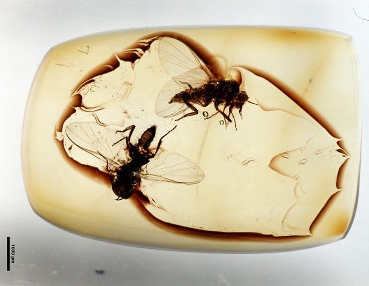 These black flies are preserved in 40 million-year-old Baltic amber.
