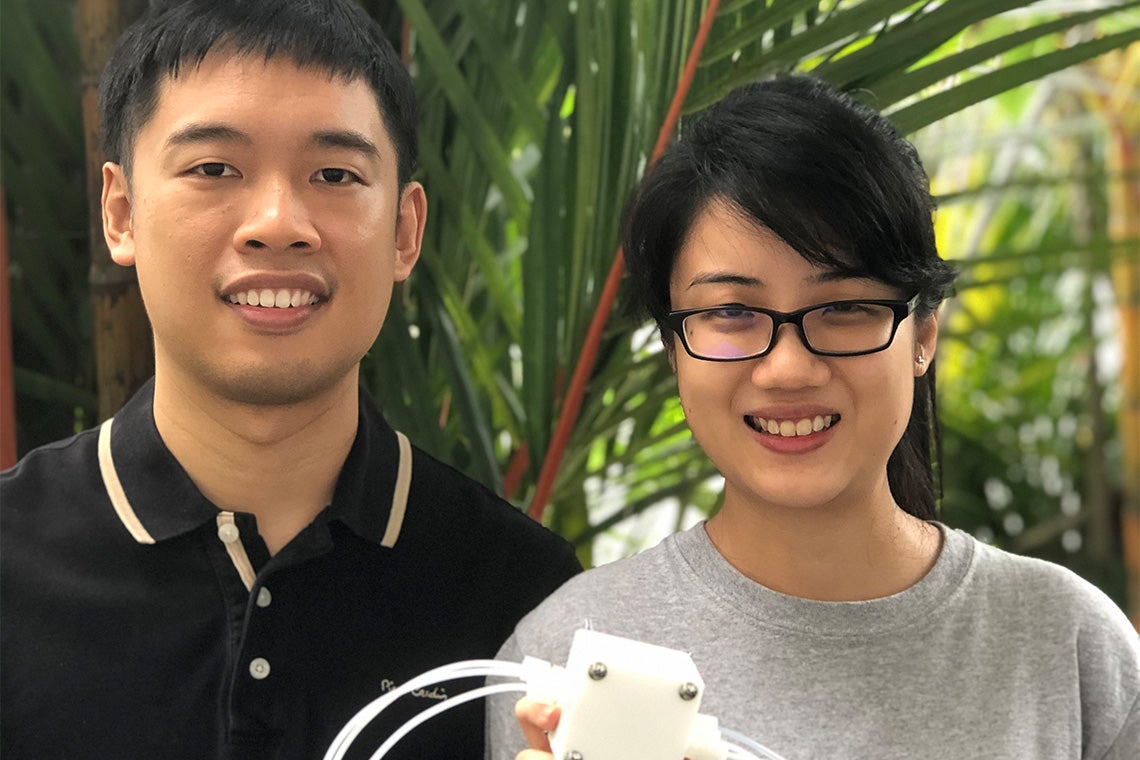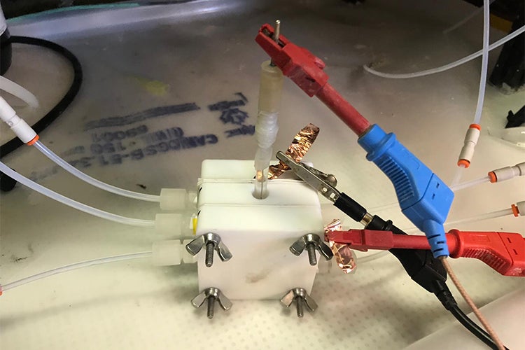 In this prototype electrolyzer, 97 per cent of the ethylene that undergoes the conversion reaction is transformed to ethylene oxide. The electrochemical process provides a low-emission alternative to established industrial methods, which normally generate about a tonne of CO2 per tonne of ethylene oxide (photo courtesy Wan Ru Leow)