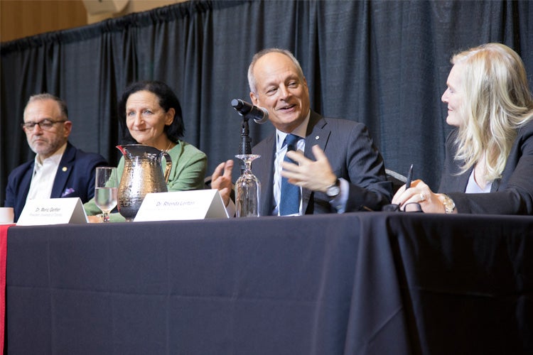 The symposium began with a panel discussion with senior leaders from the four universities: U of T President Meric Gertler, OCAD President and Vice-Chancellor Sara Diamond, York President and Vice-Chancellor Rhonda Lenton and Ryerson Vice-President of Research and Innovation Steven Liss.