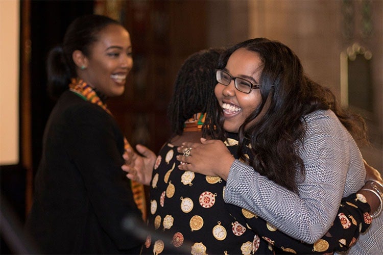 U of T PhD student Huda Hassan (left) looks on as students hug at Black Grad. Hassan has helped other Black women apply to PhD programs (photo by Geoffrey Vendeville)