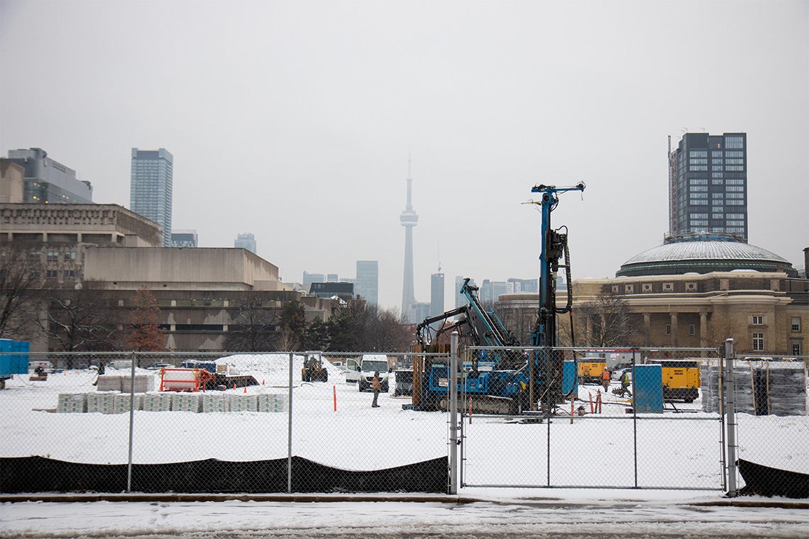 The geoexchange system – installed alongside U of T’s Landmark Project, which aims to make the St. George campus greener, more walkable and more accessible – involves drilling boreholes deep into the ground to store of surplus heat generated by nearby mechanical systems in the summer for use in the winter.