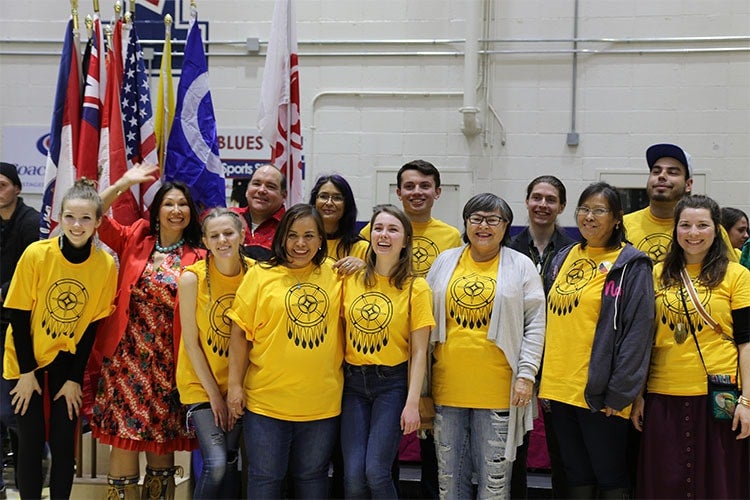 U of T's powwow student planning committee, including Julie Mogus, Trina Moyen, Grace Webster, James Bird, Jennifer Sylvester, Julie Blair, Olivia Miller, Joshua Bowman, Shirley Bryant, Zachary Biech, Priscilla Krebs, Shane Kelsey, Veronica Orozco (photo by Hannah James)