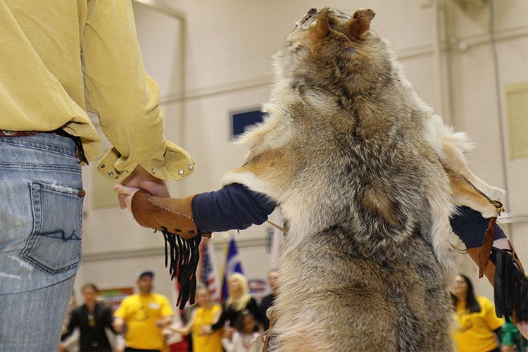 A young dancer in a coyote skin joins a round dance (photo by Hannah James)