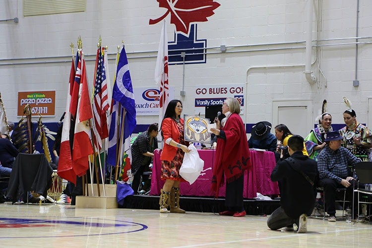 Federal Minister of Indigenous and Northern Affairs Carolyn Bennett (right) gives student Trina Moyen (left) a gift because of the student union's work organizing the powwow (photo by Hannah James)