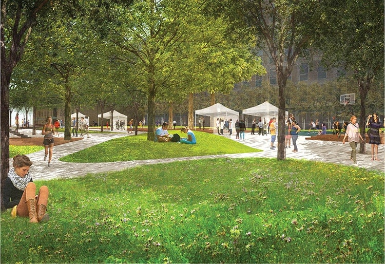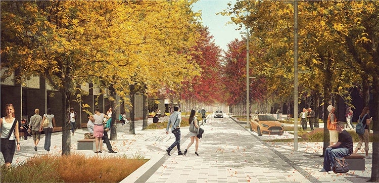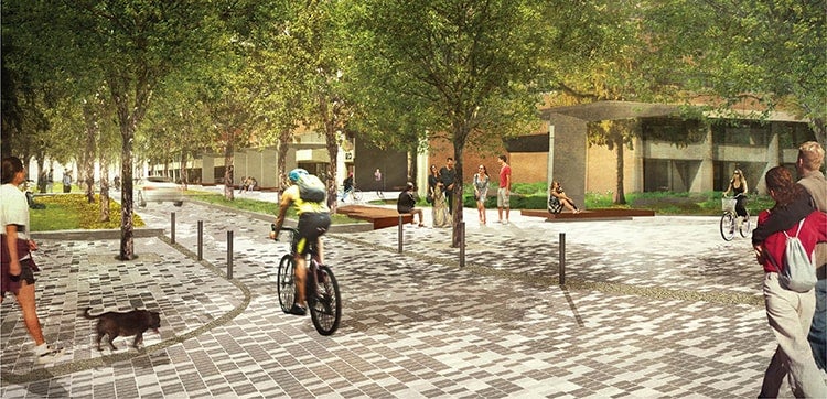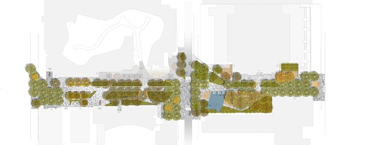 The use of greenery plays a significant part in reimagining the urban landscape, as demonstrated through the use of a new tree canopy. To encourage student use, the space will feature additional seating for informal meetings and flexible space for events.