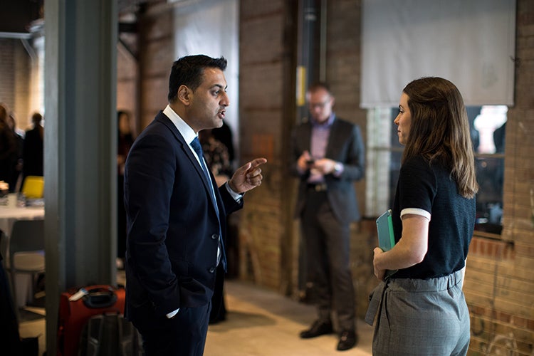 Parag Mehta, executive director and senior vice-president of the Mastercard Center for Inclusive Growth, speaks with Cadhla Gray, Master of Global Affairs graduate who worked on Team Tunisia (photo by Lisa Lightbourn)
