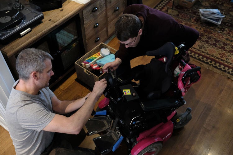 Buliung and Ross attach a camera to Buliung's daughter's wheelchair (photo courtesy of Ron Buliung)