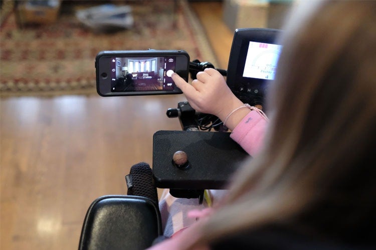 Asha uses the camera attached to her wheelchair. Research participants were encouraged to document their day in pictures (photo courtesy of Ron Buliung)