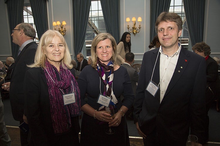 Faculty of Nursing Professors Linda McGillis Hall (left) and Kelly Metcalfe (centre) with Astrophysicist Harald Pfeiffer, an associate professor in the Faculty of Arts & Science, at the event (photo by Johnny Guatto)