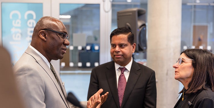 U of T Vice-President and Principal of U of T Scarborough Wisdom Tettey speaks with MP Gary Anandasangaree and MP Filomena Tassi at U of T Scarborough's Catalyst Centre (photo by Dylan Toombs)