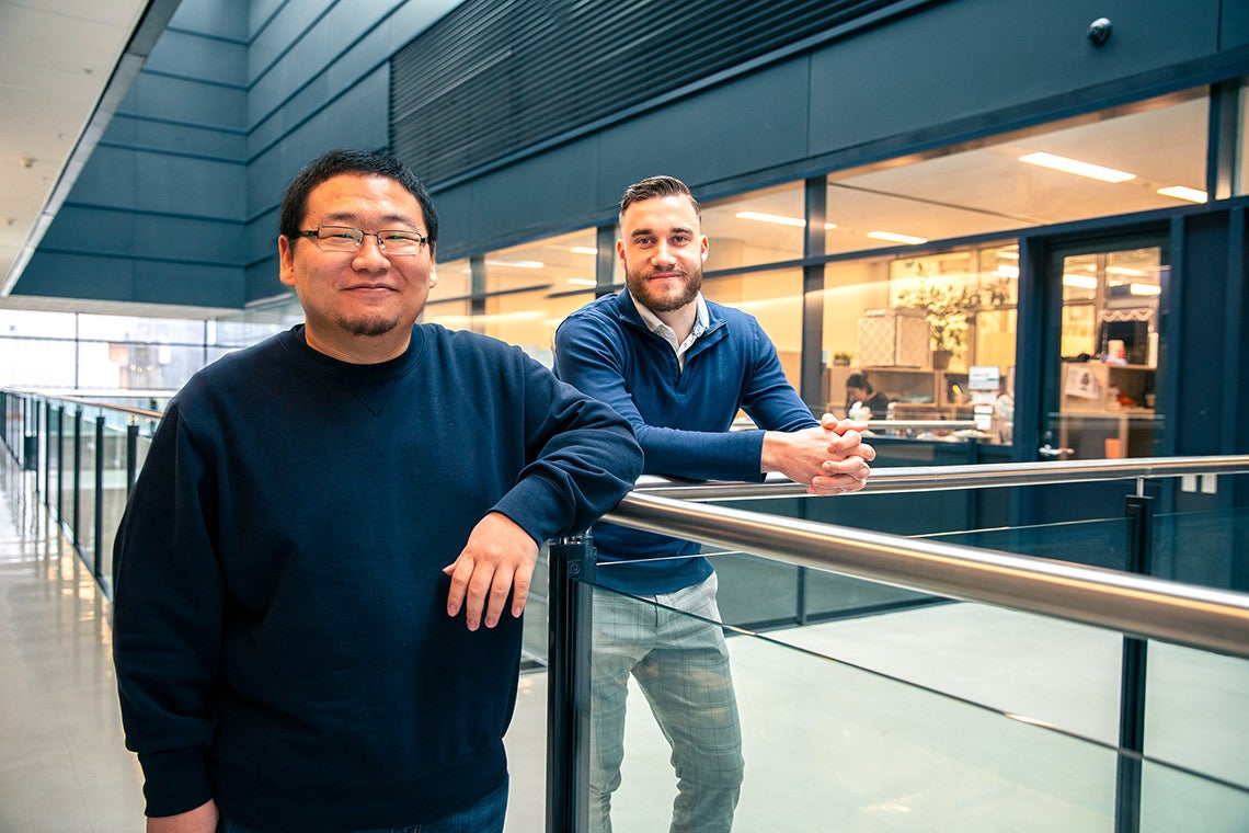 From left: Zeqing Bao, PhD trainee in pharmaceutical sciences, and Riley Hickman, PhD trainee in chemistry, are co-authors on the study published in Nature Communication (photo by Steve Southon)