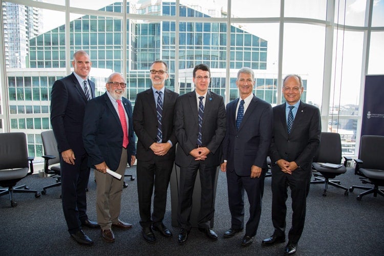 (Below: Mark Van Oene, Dr. Mark Poznansky, Dr. Trevor young, Professor Stephen Scherer, Dr. Michael Apkon and President Meric Gertler)