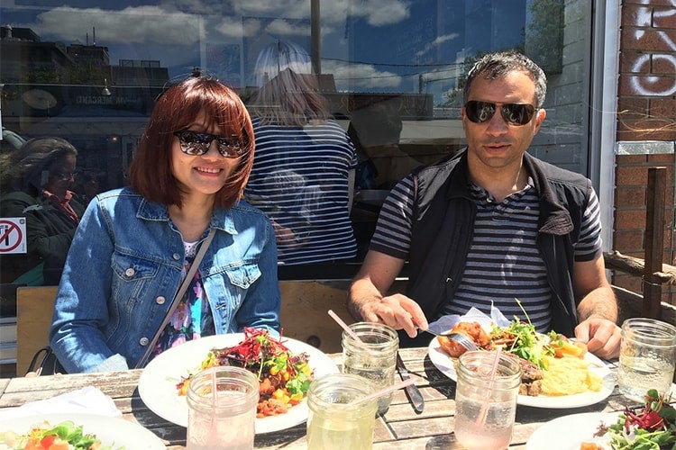 OSIA members Gladys Lim and Anil Purandaré tuck into piled-high plates at PowWow Cafe in Kensington Market (photo courtesy of OSIA)