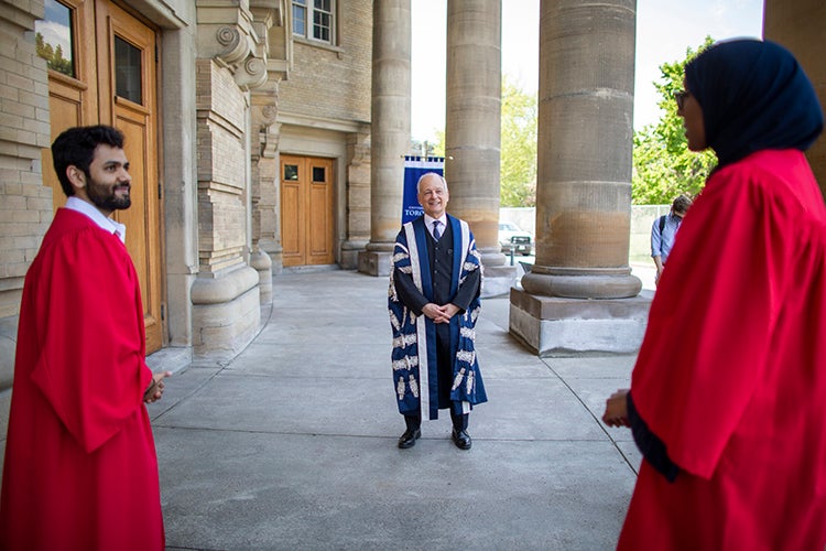 Wearing the blue-and-white president’s gown, U of T President Meric Gertler thanked the students for volunteering their time to help celebrate their classmates’ achievements.