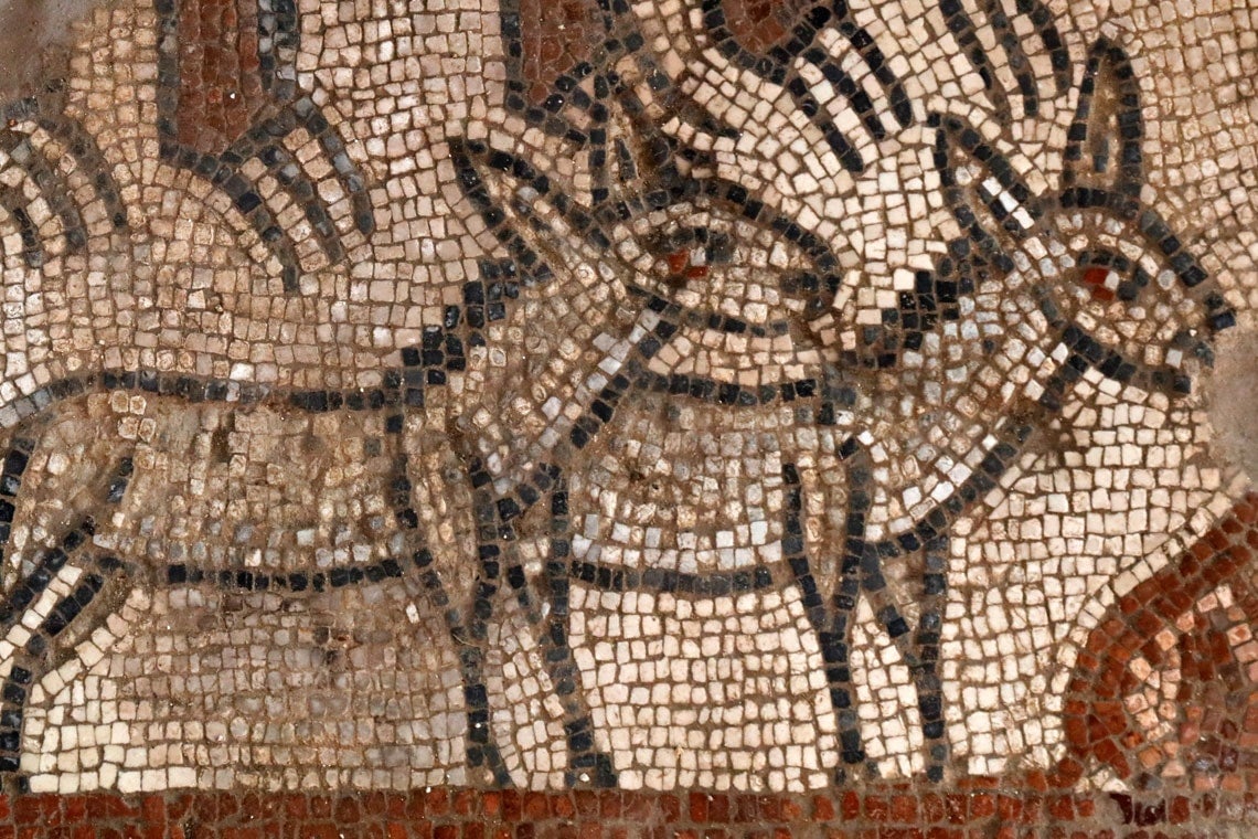 The mosaic panels decorating the floor of the synagogue’s nave (centre of the hall), portray two biblical stories: Noah’s Ark and the Parting of the Red Sea. The panel with Noah’s Ark depicts an ark and pairs of animals including elephants, leopards, donkeys, snakes, bears, lions, ostriches, camels, sheep, and goats. The scene of the Parting of the Red Sea shows Pharaoh’s soldiers being swallowed by large fish, surrounded by overturned chariots with horses and chariot drivers.