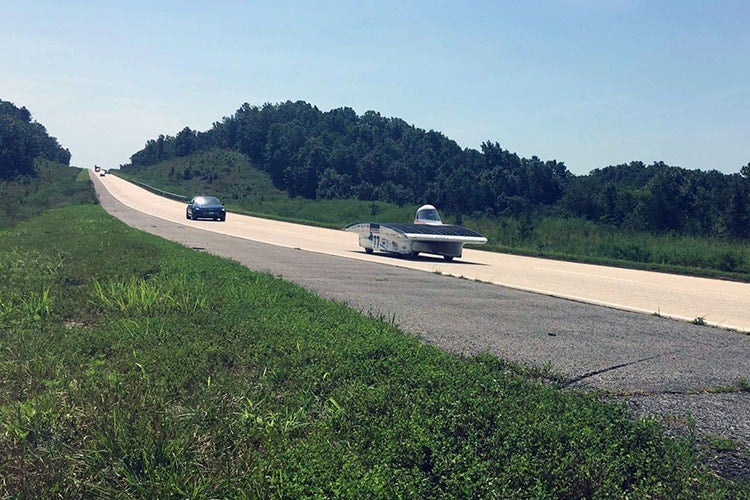 Horizon, the solar car designed, built and raced by the University of Toronto’s Blue Sky Solar Racing team races across Missouri at the American Solar Challenge 2016 (photo courtesy of Blue Sky Solar Racing)