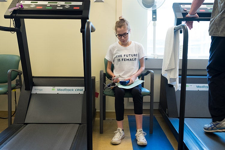 Elspeth Arbow during a physiotherapy session at Toronto General Hospital after her double-lung transplant (photo by Geoffrey Vendeville)