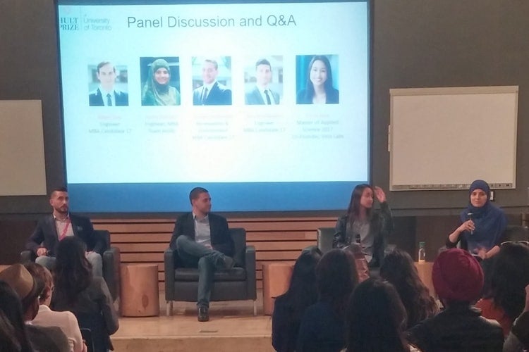 Aisha Bukhari (at right with microphone), a member of the 2015 U of T Hult Prize team, speaks on a panel at this year's Hult kickoff