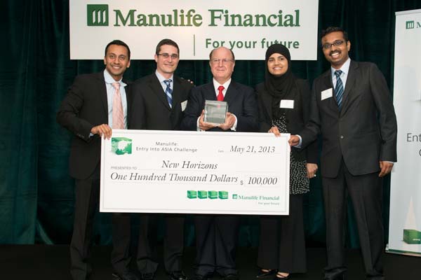 The Manulife: Entry into Asia Challenge asked undergraduate and graduate business school students at Canadian universities to create a business plan for a Canadian small or medium-sized enterprise (SMEs) to expand into any market in Asia. Competing teams demonstrated their ability to think strategically about entry into Asian markets while demonstrating their understanding of the unique attributes, challenges and realities facing Canadian SMEs.