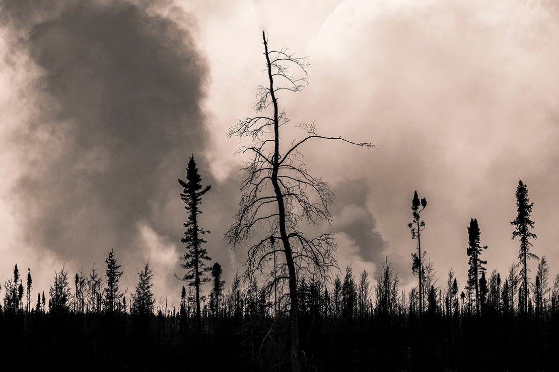 Clouds of smoke billow into the air as forest fires burn in the Northwest Territories in 2015, leaving trees damaged and charred (photo by Sherry Galey via Getty Images)