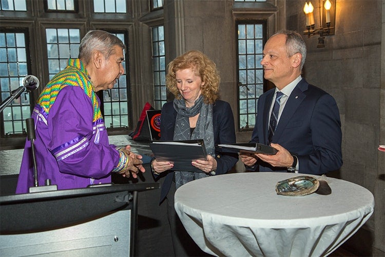 Elder Andrew Wesley (left) presents the U of T’s Truth and Reconciliation steering committee's final report to Provost Cheryl Regehr (centre) and President Meric Gertler (right) at Hart House in January (photo by Johnny Guatto)