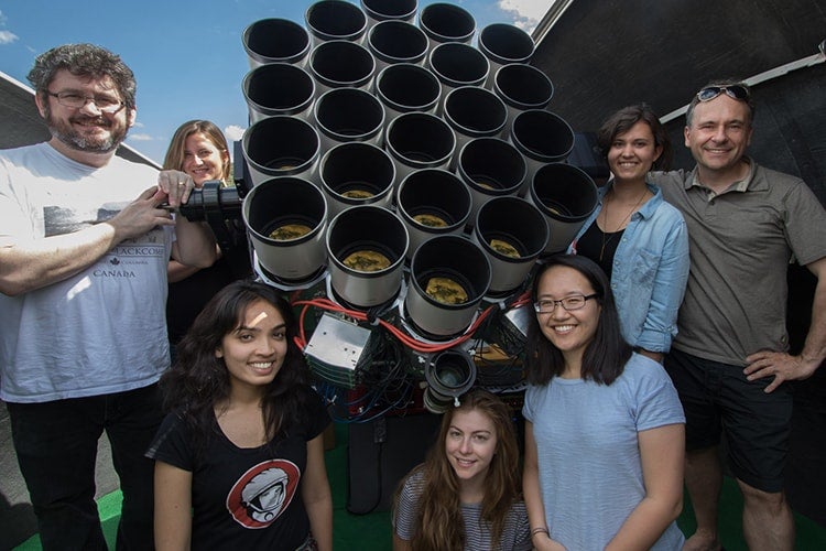 U of T Professor Robert Abraham (left) and Yale Professor Pieter van Dokkum (right), with their team of graduate students from both universities. They are standing with one-half of the 48-lens Dragonfly array at its home site in New Mexico