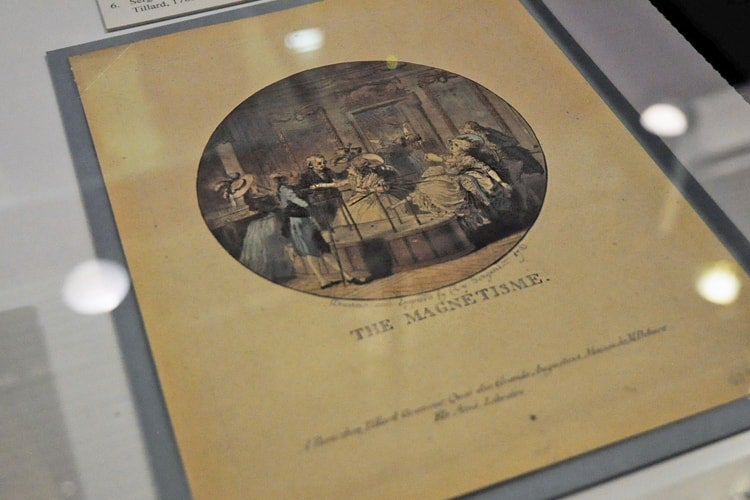 This is the first illustration of a séance from the 18th century. It may even depict Mesmer himself (third from left). Patients are grasping iron rods protruding from the water. They applied them to ailing body parts, to transfer therapeutic magnetism to their bodies (photo by Romi Levine)