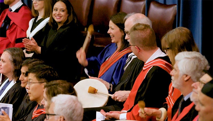 This year, Law honoured three Indigenous grads –Sinéad Charbonneau, Douglas Varrette and Michael Dockstator – with a special drumbeat played after each of their names, as they were called to the stage in Convocation Hall. The drum has been a part of convocation ceremonies for several years, Carling said, and was made specifically to honour grads.
