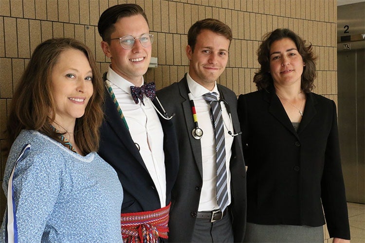 At the Faculty of Medicine's Office of Indigenous Medical Education, Indigenous Peoples' Undergraduate Medical Education Program Coordinator Dawn Maracle presented beaded stethoscopes to 2017 undergrads Ryan Giroux and Cameron Landry on the day of their convocation.