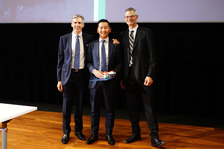 Richard Zhang (centre) with Innis College Principal Charlie Keil (left) and Innis College registrar Donald Boere (photo by Chiao Sun)