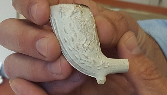A ceramic pipe stummel embossed with symbols – a Masonic sign and a bird – found near the Lime Ridge Monument at U of T (photo by Hannah James)